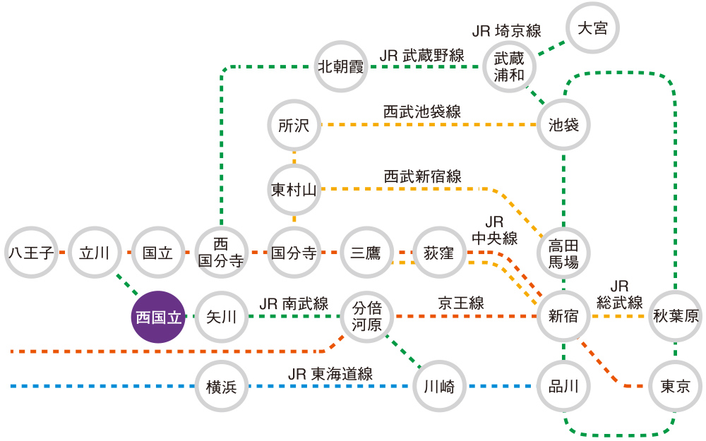 :JR中央線国立駅(南口)より「立川駅南口行き(第三小学校/立川病院経由)」乗車、富士見台四丁目下車 徒歩3分