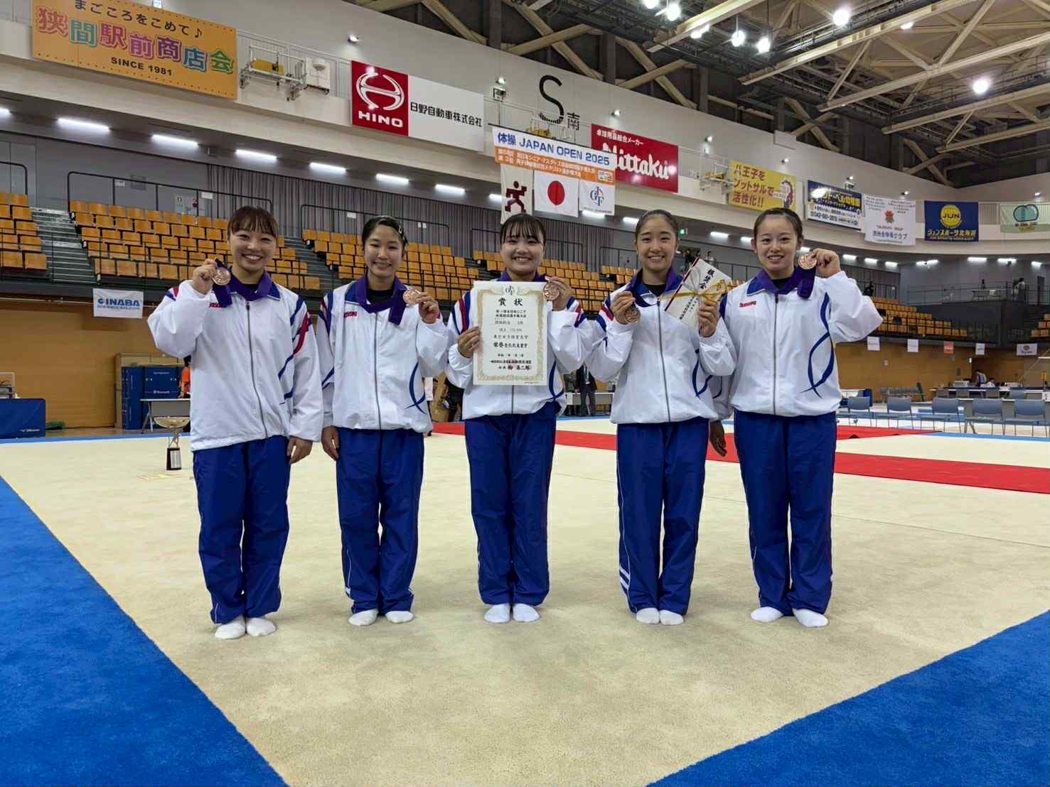 3年ぶりに全日本団体選手権の出場資格を獲得することができ、チーム全員が初出場となりましたが、1日目の会場練習からいつも通り落ちついた雰囲気で練習することができました。本番ではいくつかミスもありましたが、最後まで一生懸命チーム一丸となり、12演技を繋ぐことが出来ました。