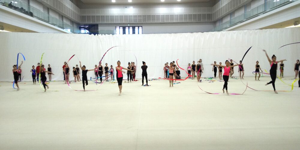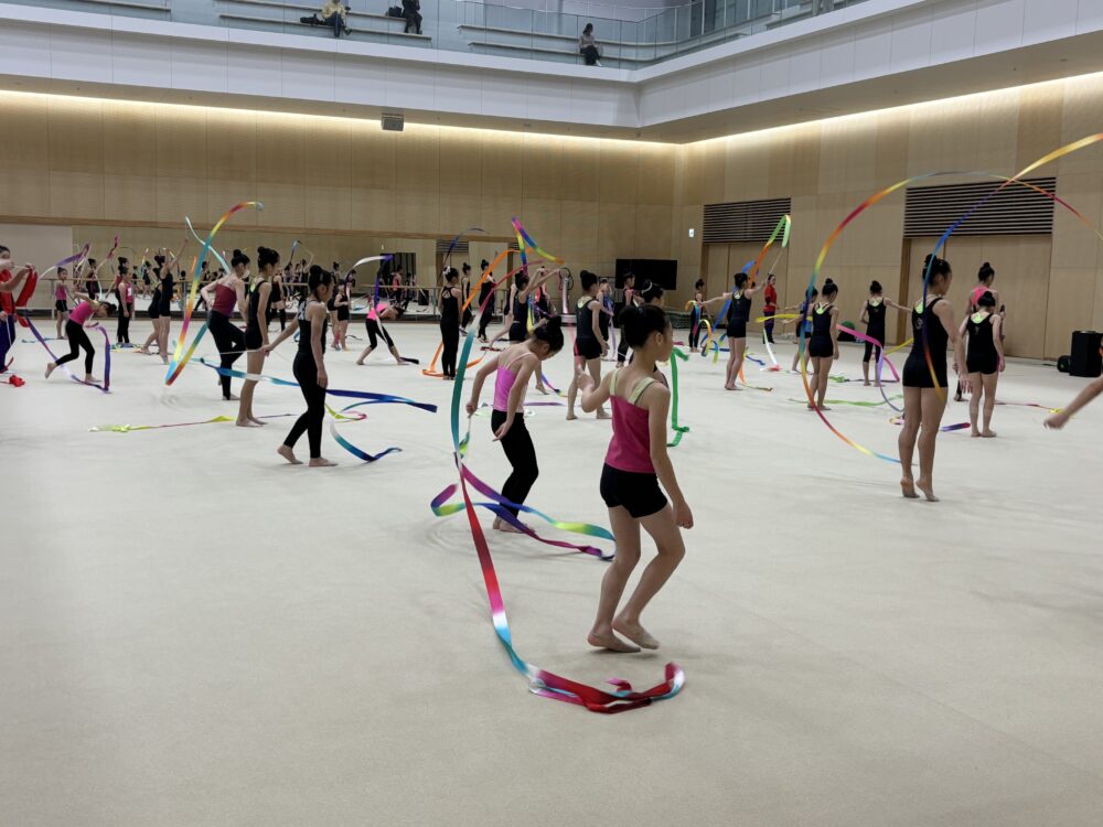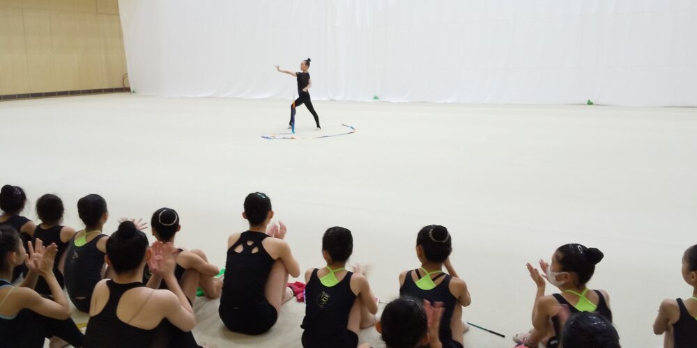 第4回は経験者中上級レッスン。小中学生41名が参加し、リボンの基礎トレーニングを中心にレッスンを行いました。 受講者の皆さんは、現役選手である講師からの説明やアドバイスに熱心に耳を傾けながら集中して練習に取り組んでいました。