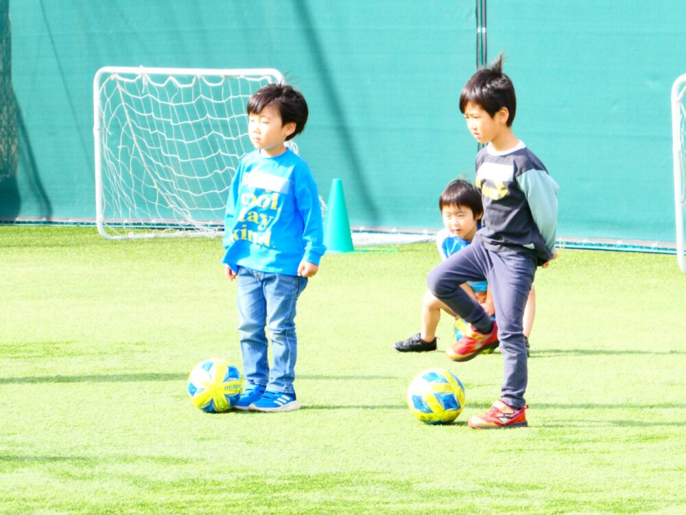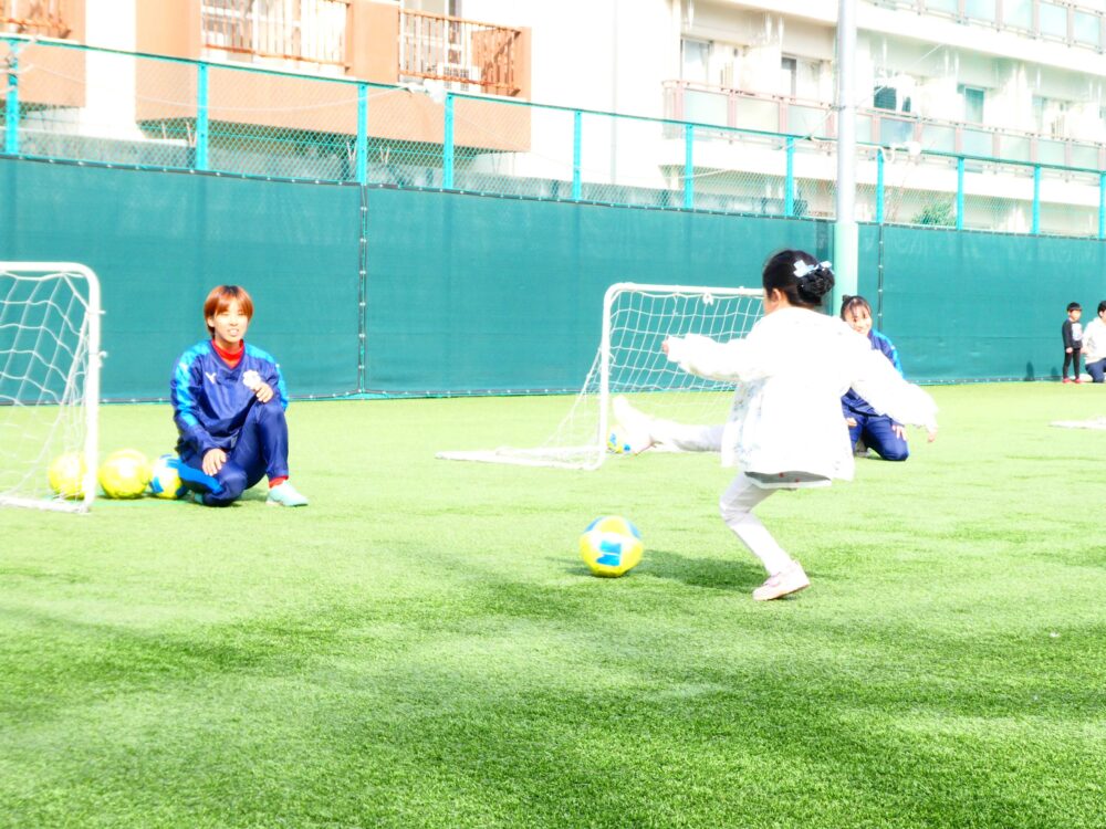 ドリブルして小さなゴールに向かってキック!入ったかな? みんな上手にシュートできていました。
