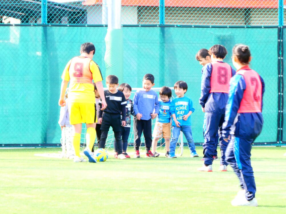 子ども達は全員で小さなゴール前に並んで、大学生のシュートを阻止! 試合結果は子ども達の勝利でした。