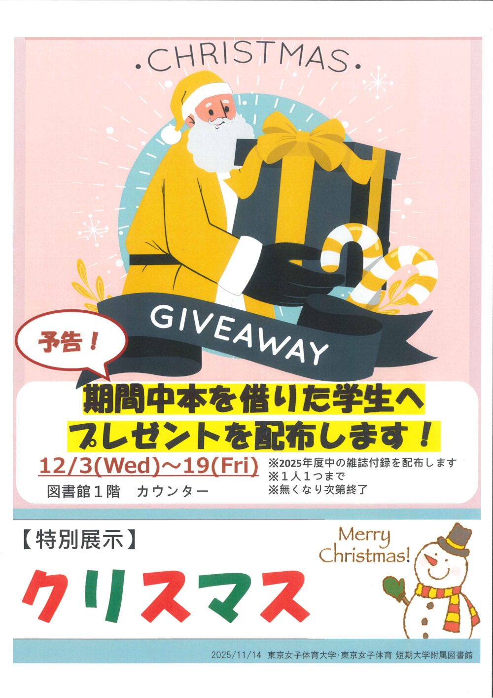 また、12/3(水)~12/19(金)の期間中に、本を借りた学生へプレゼントを配布する予定です。