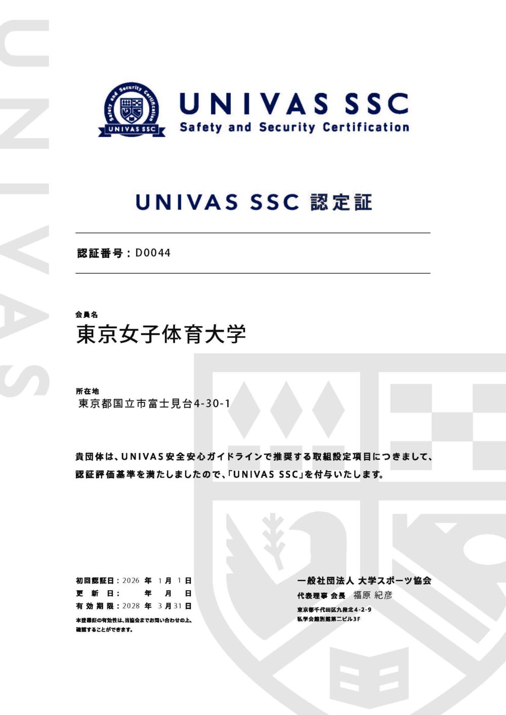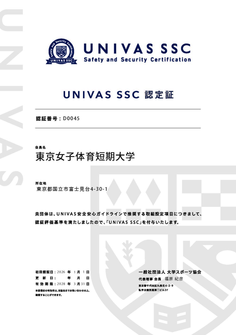2026年1月1日、本学(大学・短期大学)は一般社団法人大学スポーツ協会(UNIVAS)が制定する安全安心認証「UNIVAS Safety and Security Certification(UNIVAS SSC)」制度の会員に認定されました。
